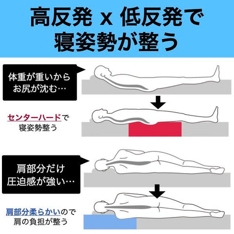 高反発と低反発の両方を使用することで、寝心地の3大要素「寝返り」「体圧分散」「綺麗な寝姿勢」をサポートします。